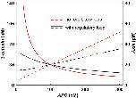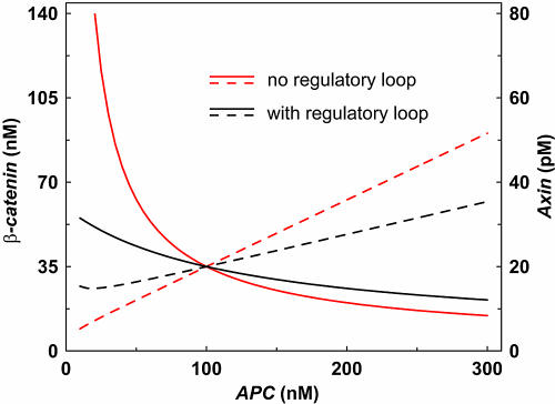 Figure 5. Effect of the Regulatory Loop for Axin DegradationThe case “with regulatory loop” takes into account that axin degradation is APC-dependent (black curves). Alternatively, the case without this regulatory loop is considered (red curves). For the regulatory loop, the rate law (5) is used assuming that in the reference state the APC activation is half of its maximum (KM = 98.0 nM). The value of k′15 was chosen such that in the reference state both cases, with and without regulatory loop, yield the same degradation rate of axin (k′15 = 0.33 min−1).