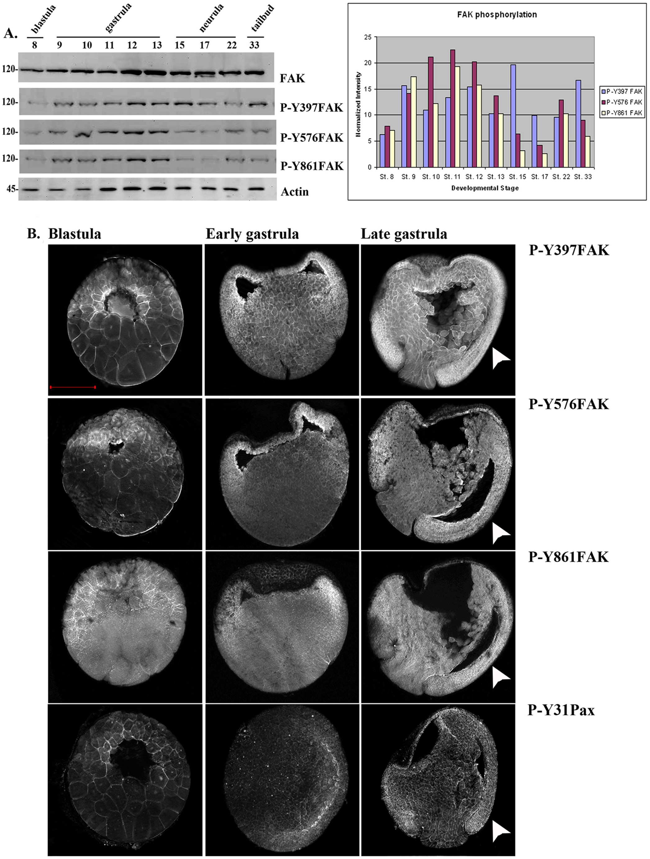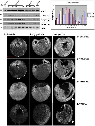Figure 1. FAK expression and phosphorylation during development. (A) Western Blots from extracts of equal numbers of embryos probed with a monoclonal antibody against the C-terminus of FAK or polyclonal antibodies against the phosphorylated tyrosine residues indicated. FAK is phosphorylated on all three residues both before and after gastrulation. The intensity values from the densitometry analysis of the western blots were normalized against total FAK amount. (B) Blastula (1st column), early gastrula (2nd column) and late gastrula embryos (3rd column) stained with P-Y397, P-Y576, P-Y861 and P-Y31paxillin antibodies as indicated. Phosphorylated FAK and paxillin can be detected on the plasma membrane from early blastula stages including the apical region of superficial blastomeres. During gastrulation elevated levels of phosphorylation are detected in the highly morphogenetic mesodermal tissues (white arrowheads). Scale bar: 400 �m. doi:10.1371/journal.pone.0042577.g001 |