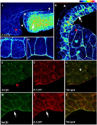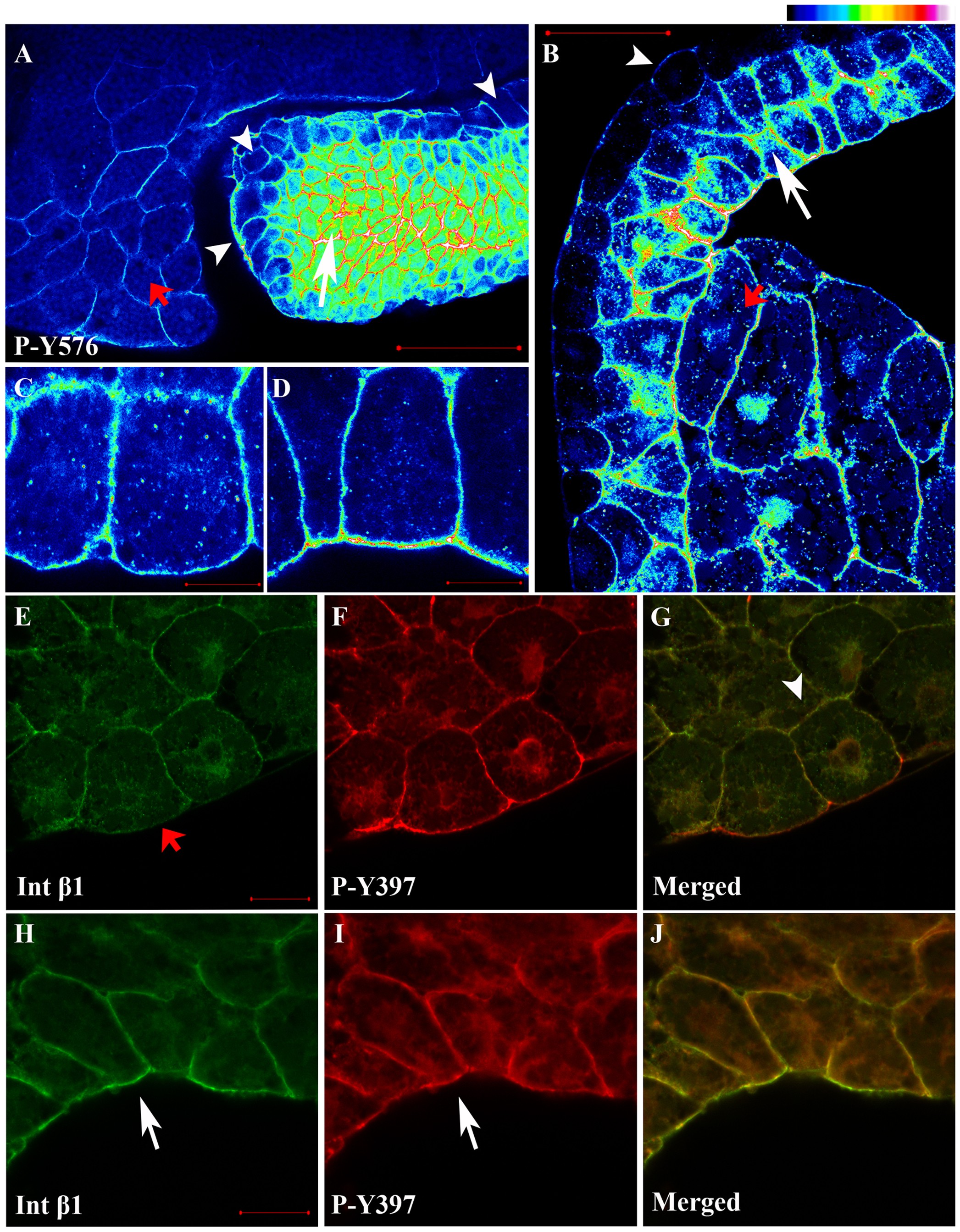 Figure 2. FAK is heavily phosphorylated in mesodermal tissues and integrin-free regions of cells. show more (A) Intensity color coded confocal section of the dorsal lip region from a whole mount immunostained gastrula stage embryo using a P-Y576 FAK antibody. Mesodermal cells (white arrow) display much higher levels of phospho-FAK than endodermal cells lining the forming archenteron (white arrowheads) and the endodermal cells of the blastopore (red arrow). (B) Same as A but showing the anterior mesendoderm and the animal cap from a whole mount immunostained gastrula stage embryo. The superficial cells of the animal cap (white arrowhead) show lower levels of phospho-FAK signal compared to deep cells (white arrow) and mesendodermal cells (red arrow). (C) High magnification color coded narrow optical section of superficial cells of the animal cap reveals that the apical surface of these cells display similar levels of phospho-FAK compared to the basolateral region while (D) the apical region of the deep cells of the animal cap facing the fibronectin ECM display significantly elevated levels of phospho-FAK compared to the basolateral region. In addition, in the deep cells of the ectoderm labeling of phospho-FAK in the basolateral region is relatively uniform but the apical region displays distinct foci of higher signal intensity (E�G) Confocal optical sections from whole mount immunostained embryos using integrin-β1 (green) and P-Y397 FAK antibodies (red). Integrin-β1 and P-Y397 FAK colocalize on the plasma membrane at cell�cell boundaries (white arrowhead). However phosphorylated FAK is also present on the apical region of the outermost cells of the embryo where integrin-β1 is absent (red arrow). (H�J) Same embryo as above but the cells facing the blastocoel cavity are imaged. Integrin-β1 and P-Y397 FAK colocalize on the apical surface of the cells facing the blastocoel (white arrows). Scale bars: (A) 100 �m, (B) 50 �m, (C, D) 10 �m, (E) 30 �m, (H) 20 �m. doi:10.1371/journal.pone.0042577.g002 |