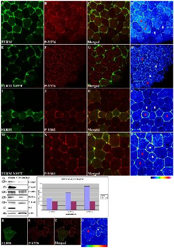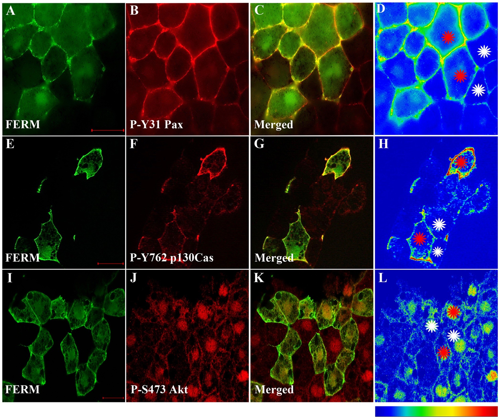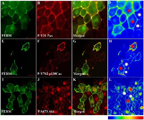 Figure 6. The FERM domain activates endogenous FAK leading to increased phosphorylation of FAK/Src targets. (A�D) Embryos injected with HA-FERM mRNA in two blastomeres, at the animal pole, at the four cell stage were processed for immunofluorescence using anti-HA (green) and anti-P-Y31 paxillin (red) antibodies. C is the merged image and D is an intensity color coded image. FERM expressing cells display elevated levels of phosphorylated paxillin (red stars) when compared with un-injected neighbouring cells (white stars). (E�H) Same as (A�D) but comparing phosphorylation levels of p130Cas on tyrosine 762 between FERM expressing and control cells. FERM expressing cells show elevated levels of phosphorylated p130Cas (red stars), when compared with un-injected cells (white stars). (I�L) Same as (A�D) but comparing levels of phosphorylated Akt on serine 473 between FERM expressing and control cells. Levels of phosphorylated Akt are comparable in FERM expressing cells to those of control neighboring cells. Scale bars: 20 �m. doi:10.1371/journal.pone.0042577.g006 |