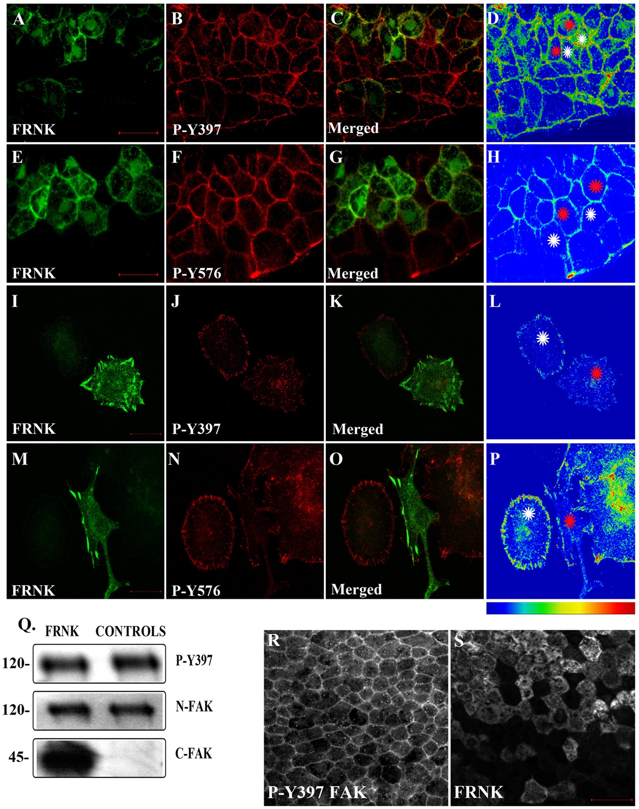Figure 3. FRNK does not act as a dominant negative in early Xenopus embryos. show more (A�D) Optical sections of whole mount immunostained embryos injected with 1 ng GFP-FRNK at the two dorsal blastomeres at the four-cell stage. Embryos were stained with anti-GFP (A) and anti-P-Y397 (B). C is the merged image and D an intensity color coded image of the anti-P-Y397 signal. FRNK injected cells are indicated with red stars and control cells with white stars. FRNK expression fails to reduce the phosphorylation levels of endogenous FAK on tyrosine 397. (E�H) Same as A�D, but the embryos were stained with anti-GFP (E) and anti-P-Y576 (F). FRNK expressing cells display similar levels of phosphorylation on tyrosine 576 as neighboring control cells. (I�L) Confocal images of A6 Xenopus cells transfected with GFP-FRNK. Cells were stained with anti-GFP (I) and anti-P-Y397 (J). K is the merged image and L an intensity color coded image of the anti-P-Y397 signal. FRNK expression leads to reduction of the phosphorylation levels of FAK on tyrosine 397 at the focal adhesions. (M�P) Same as I�L but the cells were stained with anti-GFP (M) and anti-P-Y576 (N) antibodies. FRNK expression leads to downregulation of the endogenous phosphorylation levels of FAK on tyrosine 576 at the focal adhesions. (Q) Western blot analysis of control and injected gastrula stage embryos with 1 ng FRNK at the animal pole of both blastomeres of two cell stage embryos. FRNK expression fails to reduce endogenous FAK phosphorylation on tyrosine 397. FRNK expression was verified using a FAK antibody raised against the C-terminus of the protein. (R�S) Localization of P-Y397 FAK (R) and FRNK (S) in animal pole cells of stage 10 Xenopus embryos. P-Y397 FAK shows strong membrane localization while FRNK is primarily cytoplasmic in these cells. Scale bars: (A) 40 �m, (E) 30 �m, (I) 20 �m, (M) 20 �m, (R�S) 40 �m. |
