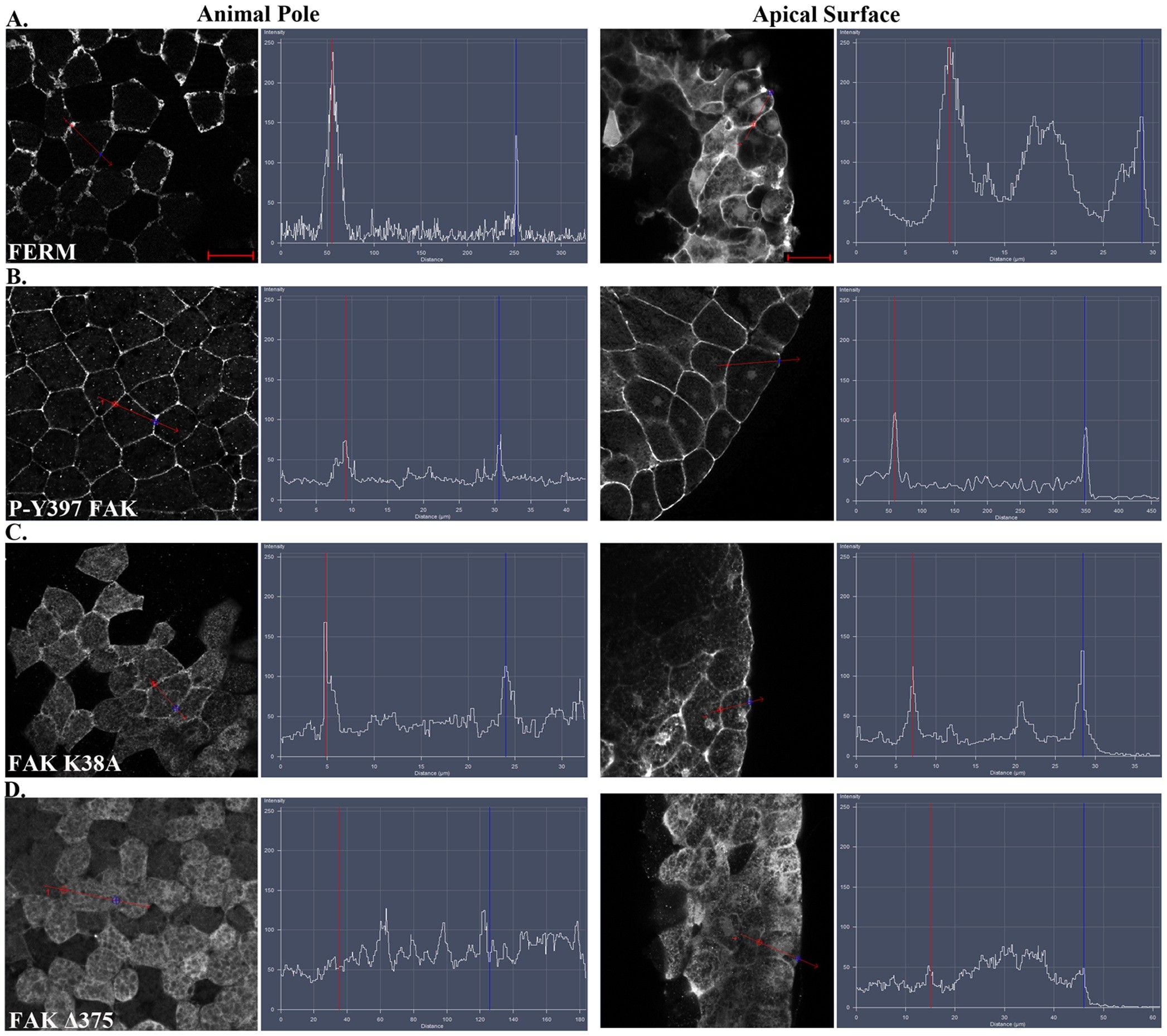 Figure 4. The FERM domain is necessary and sufficient for membrane localization of FAK at integrin-free regions. show more Confocal images and intensity profiles of the indicated constructs after whole mount immunostaining. The first column are top views of superficial cells of the animal cap in intact embryos and the second column are views from sagittally sectioned embryos that reveal the localization of each construct on the apical surface of superficial cells. Apical region of superficial blastomeres is to the right. (A) The FERM domain shows strong plasma membrane localization in the top view and is strongly localized to the apical surface. (B) Endogenous phosphorylated FAK shows very strong plasma membrane localization in the top view and is localized on the basolateral and apical surface of the cell. (C) Full length FAK with the point mutation K38A exhibits strong membrane localization. (D) Deletion of the FERM domain (HA-Δ375 FAK construct) abolishes the plasma membrane localization of FAK. Scale bars: 25 �m. doi:10.1371/journal.pone.0042577.g004 |