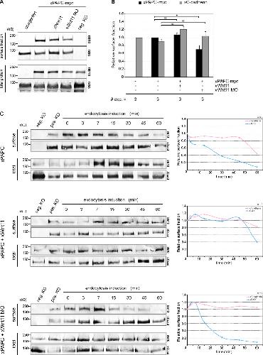 Figure 3. Wnt-11 stabilized cell surface PAPC, whereas C-cadherin remained unaffected. (A) Cell surface biotinylation assay performed with DMZ explants. Cell surface and total protein amount of xPAPC-myc (9E10) and endogenous xC-cadherin (6B6) were detected by Western blotting. xWnt-11 depletion reduced cell surface amount of xPAPC-myc, whereas cell surface level of endogenous xC-cadherin was not effected. neg. KO, negative control. (B) Relative cell surface amounts of xPAPC-myc and endogenous xC-cadherin in dependency of xWnt-11, calculated as described in Materials and methods. Error bars show SEM. Student’s t test was performed (*, P < 0.05). # exp., number of independent experiments. (C) Biotin pulse-chase experiment performed with DMZ explants. At the indicated induction times, the residual biotin-labeled (surface) and total protein amount of xPAPC-myc (9E10) and endogenous xC-cadherin (α-Ccad) were detected by Western blotting. Relative surface amounts of xPAPC-myc and endogenous xC-cadherin were plotted over endocytosis induction time. Cell surface xPAPC was stabilized in xWnt-11–overexpressing DMZ explants, whereas xWnt-11 depletion led to a faster degradation of xPAPC membrane fraction. xWnt-11 did not affect the cell surface expression of xC-cadherin. Injection amount was as follows: 1 ng xPAPC-myc RNA, 40 pg xWnt-11 RNA, and 1 pmol xWnt-11 MO. pos. KO, positive control. n, number of independent experiments. |