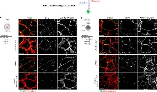 Figure 9. Lateral cis-dimerization of C-cadherin is reduced by coexpression of Wnt-11, Fz7, and PAPC in animal caps and DMZ explants. (A and B) In vivo monitoring of lateral clustering of xC-cadherin by expression of the split YFP xC-cadherin constructs in DMZ explants (A) and in animal caps (B). Cell membranes were labeled in all samples with GAP43-mCherry. Whereas xWnt-11/xFz7 and xPAPC alone had no apparent effect, the combination of all three reduced lateral clustering of xC-cadherin. Injection amount was as follows: 1 ng xC-cadherin–YC/YN RNA, 500 pg xFz7 RNA, 500 pg xPAPC RNA, or 20 pg xWnt-11 RNA. Bars, 20 µm. |