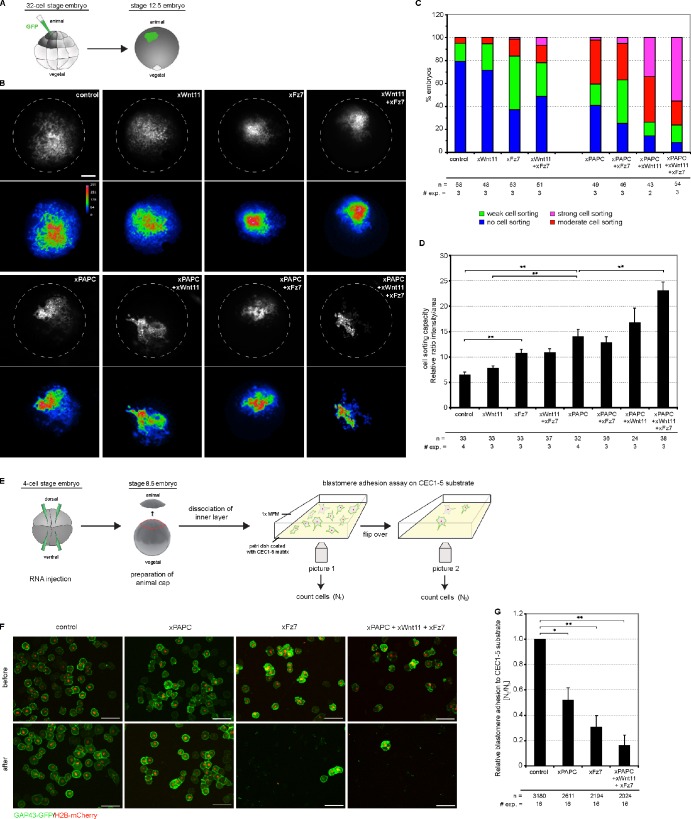 Figure 5. Wnt-11/Fz7 and PAPC cooperate in decreasing C-cadherin–mediated cell adhesion. (A) Scheme of cell dispersal assay. One animal blastomere of a 32-cell–stage embryo was injected with synthetic mRNAs together with the lineage tracer GAP43-GFP. At stage 12.5, intermingling of GFP-expressing cells was monitored. The patch morphology reflects changes in cell sorting activity as a result of changes in cell adhesion: tight patches with sharp borders and high fluorescence intensity indicate strong cell sorting properties. (B) Cell dispersal assay. Representative images of stage-12.5 embryos. Dashed lines reflect embryo size. Bar, 900 µm. Corresponding pseudocolor images show fluorescence intensity. Relative intensity of fluorescence is indicated by the color bar, where blue and violet represent the lowest and the highest level of detectable fluorescence, respectively. (C) Evaluation of the increasing changes in cell sorting activity. n, number of embryos; # exp., number of experiments. (D) Quantitative evaluation of cell dispersal assay. The diagram displays the cell sorting activity expressed as the relative ratio between intensity and area (for more details, see Fig. S3 and Materials and methods). Error bars indicate SEM. Student’s t test was performed (**, P < 0.005). (E) Scheme of blastomere adhesion assay. Synthetic mRNAs were injected in the animal hemisphere of 4-cell–stage embryos together with the lineage tracers GAP43-GFP and H2B-mCherry. At stage 8.5, animal caps were dissected. The blastomeres of the inner layer were dissociated, spotted on 1 µg/ml CEC1-5–coated substrates, and allowed to adhere. The adhesion strength of blastomeres was measured by the ratio of the number of blastomeres remaining attached after (Nt) versus the number before (N0) flipover of the Petri dish. (F) Representative images of dissociated blastomeres expressing the indicated constructs attached to the CEC1-5 substrate before and after the flipover. Bars, 100 µm. (G) Quantification of the blastomere adhesion assay. The diagram displays the xC-cadherin adhesion index as the relative ratio between blastomeres attached to the CEC1-5 substrate after and before flipover. Injection amount was as follows: 500 pg xPAPC RNA, 500 pg xFz7 RNA, 20 pg xWnt-11 RNA, 100 pg GAP43-GFP RNA, and 250 pg H2B-mCherry RNA. Error bars indicate SEM. Student’s t test was performed (*, P < 0.05; **, P < 0.005). n, number of counted blastomeres. |