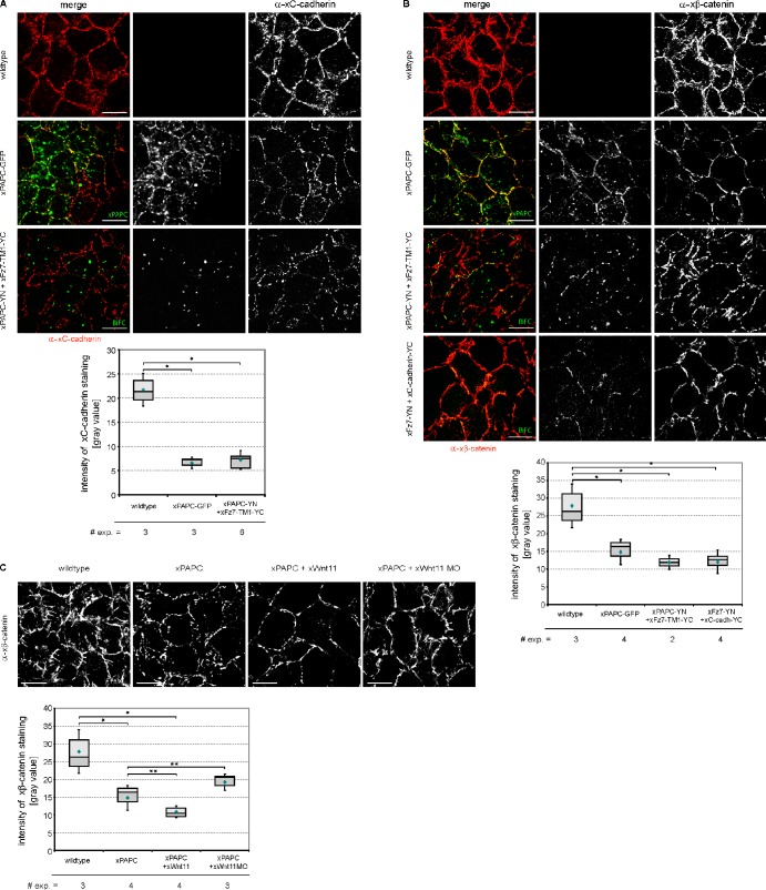 Figure 8. PAPC–Fz7 and C-cadherin–Fz7 interactions reduce cadherin–catenin complexes at cell membranes. DMZ explants were injected with the indicated constructs, fixed, and fluorescently immunostained using either specific xC-cadherin (6B6) or xβ-catenin antibody (PGDS 7D12). (A, top) Fluorescent immunostainings for endogenous xC-cadherin. Endogenous xC-cadherin membrane staining was reduced upon xPAPC-GFP expression and upon formation of the xPAPC–xFz7–TM1 complex (BiFC). (bottom) Quantitative evaluation of endogenous xC-cadherin staining. The mean grayscale value (intensity) of xC-cadherin staining was measured and plotted into box and whisker diagrams (box plots). For more details, see Materials and methods. (B and C) Fluorescent immunostainings for endogenous xβ-catenin. Endogenous xβ-catenin membrane staining was reduced upon xPAPC-GFP expression and upon formation of the xPAPC–xFz7–TM1 and xC-cadherin–xFz7 complexes. xPAPC-induced reduction of xβ-catenin could be restored by Wnt-11 depletion. The graphs show quantitative evaluation of endogenous xβ-catenin staining. The mean grayscale value (intensity) of xβ-catenin staining was measured and plotted into box and whisker diagrams (box plots). Injection amount was as follows: 1 ng xPAPC-GFP RNA, 1 ng xPAPC-YN RNA, 1 ng xC-cadherin–YC RNA, 500 pg xFz7-YN RNA, 500 pg xFz7-TM1-YC, 20 pg xWnt-11 RNA, and 1 pmol xWnt-11 MO. Bars, 20 µm. In the box plots, each box represents the values between the 25th (dark gray) and 75th quartiles (light gray). The line within the boxes indicates the median values, and the blue rhombi show the mean values. Error bars indicate SEM. Student’s t test was performed (*, p < 0.05 to wild type; **, p < 0.05 to xPAPC). # exp., number of experiments. |
