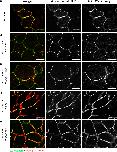 Figure 2. C-cadherin surface expression is not affected by Wnt-11 and Fz7. Time-lapse microscopic analysis of xC-cadherin subcellular localization during convergent extension. 16-cell–stage embryos were injected into the DMZ region with 500 pg xC-cadherin–EGPF RNA alone or in combination with 20 pg xWnt-11 RNA, 1 pmol xWnt-11 MO, 500 pg xFz7 RNA, or 1.6 pmol xFz7 MO. 200 pg GAP43-mCherry RNA was coinjected in all samples as a cell membrane tracer. At stage 10.25, DMZ explants were cut, and subcellular localization of xC-cadherin–EGFP was analyzed. (A–E) Representative images of confocal time-lapse videos are shown. Neither overexpression nor depletion of xWnt-11 or xFz7 had an effect on xC-cadherin–EGFP subcellular localization. Bars, 20 µm. |