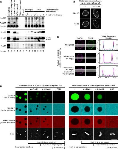 Figure 2. Depletion of Nup62 Complexes Leaves the NPC Barrier Largely IntactX. laevis egg extracts were depleted by using anti-Nup54 to remove the Nup54â 58â 62 complex, anti-Nup62 to remove the Nup54â 58â 62 and Nup62â 88â 214 complexes, or WGA to deplete all O-GlcNAc-modified nucleoporins. The specificity of antibodies is also shown in Figure S1.(A) Immunoblot analysis of the components used for nuclear assembly. The endogenous FG nucleoporins Nup358, Nup214, Nup153, and Nup62 were detected by mAB414. The various isoforms of Nup54 were detected by rabbit anti-Nup54. For quantification, depleted cytosols were blended with increasing amounts of undepleted cytosol. A Nup62 signal became detectable upon readdition of as little as 0.25% undepleted extract to a Nup62-depleted extract (compare lanes 2 and 7). This matches the quantification by integrating fluorescent signals (not shown). Thus, anti-Nup62 depleted the two Nup62 complexes to residual levels of no more than 0.25%. Those complexes were also depleted with WGA (lane 4). Membranes prepared by conventional methods contained soluble nucleoporins unless they were further purified by flotation (see Figure S1D).(BâD) Nuclei were assembled from Xenopus sperm chromatin, membranes, and interphase egg extracts that had been depleted as indicated. (B and C) Nuclei were fixed and analyzed by immunofluorescence (IF) with indicated NPC markers. The Nup62 signal remaining after anti-Nup54 depletion can be assigned to the nondepleted Nup62â 88â 214 complex. The Nup107 signal indicates that depletions of Nup62-containing complexes did not interfere with assembly of the NPC scaffold. Nup62 depletions were further analyzed by line profiles. Note that addition of as little as 1% undepleted extract lead to reappearance of a nuclear rim signal. (D) Test of NPC barrier function in assembled nuclei. Nucleocytoplasmic distributions of fluorescent permeation probes were recorded by confocal scans through unfixed transport reactions. Left and right panels derive from an identical experiment but were imaged at different magnifications. WGA-depleted nuclei failed in active import and export as well as in dextran exclusion. Scale bars, 25 μm. Further data on depletion phenotypes are provided in Figure S2.In transport-competent nuclei, the DAPI-stained chromatin did not necessarily fill the complete nuclear interior. This represents a well-documented peculiarity of the amphibian nuclear assembly system that becomes most obvious after longer incubation times (see e.g., Figure 7A in Lu et al., 1997). It probably relates to the facts that in-vitro-assembled nuclei are an early embryonic type whose nuclear organization is optimized for extremely rapid cell cycles and that early embryonic chromatin is transcriptionally inactive and might therefore relapse to a more condensed state once replication is completed.