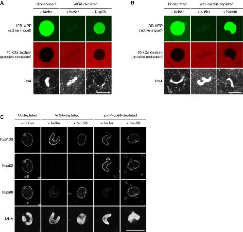 Figure 4. Nup98 Dominates the Permeability Barrier of Xenopus NPCsNuclei were assembled as in Figure 2 using depleted or nondepleted egg extracts. Recombinant Xenopus Nup98 was added to its original endogenous concentration of 200 nM (Figure 3B).(A and B) Nup98 restores passive nuclear exclusion and active import in WGA- and Nup98-depleted nuclei. See also Figure S3A.(C) Composition of depleted and restored NPCs. Nuclei characterized in (A) and (B) were fixed and analyzed by IF with indicated NPC markers. Note that the low level of residual Nup98 in WGA-depleted NPCs was insufficient for an operational permeability barrier.Scale bars, 25 μm.