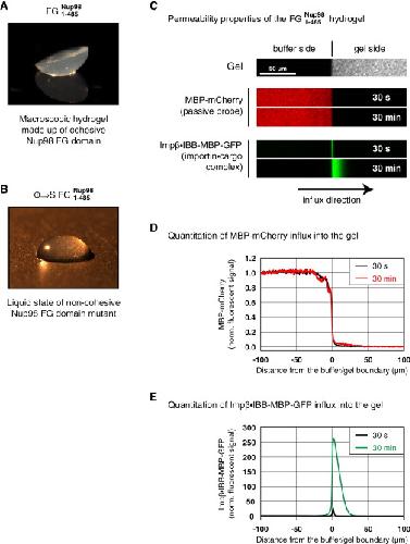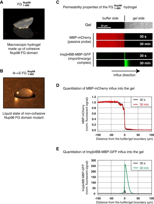Figure 5. The Isolated FG Domain of Nup98 Forms a Hydrogel of Exquisite NPC-like Selectivity(A) The O-GlcNAc-modified and lyophilized FG domain of Xenopus Nup98 was dissolved at 200 mg/ml in buffer and allowed to form a gel. It was then inverted onto a plain surface and photographed. Note that the gel retained its original shape.(B) Photograph shows the ÏâS mutant of the same domain for comparison. It remained liquid under identical conditions, demonstrating that hydrophobic Ï residues (Phe, Leu, and Ile) are essential for hydrogelation.(C) Permeability properties of the Nup98 FG hydrogel. The gel was formed on a microscopic slide as in (A) and equilibrated in permeation buffer. Upper panel shows a confocal scan through the buffer-gel boundary, detecting the Atto647-labeled tracer of the gel. An MBP-mCherry fusion was added, along with an import complex (comprising importin-β and an IBB-MBP-GFP fusion), to the buffer side of the gel. Gel entry of both species was recorded at 30 s and 30 min time points.(D) Quantitation of MBP-mCherry influx into the Nup98 gel shown in (C). Fluorescence was normalized to the probe's concentration in the buffer (set to 1). The gel suppressed the entry of MBP-mCherry very effectively.(E) Quantitation of importin-mediated influx into the Nup98 gel. The importin-β complex became highly enriched inside the gel, yet it did not remain stuck at the buffer-gel boundary but instead moved deep into the gel. Note the different scales of the ordinate in (D) and (E).