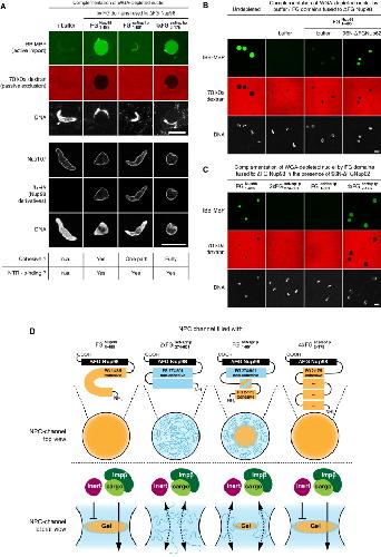Figure 7. An Operational NPC Barrier Requires a Fully Cohesive FG Domain(A) Indicated Nup98 chimeras were tested at a final concentration of 500 nM for their capacity to create a functional NPC barrier as described in Figure 6. The FG domain from Nsp1p did not yield a functional barrier. It contains an N-terminal cohesive part followed by the already mentioned long noncohesive stretch (274â601) in front of the anchor point. Replacing this noncohesive module by additional copies of the highly cohesive N terminus (4xFG 2â175) allowed formation of a selective NPC barrier. See also Figure S3B.(B) Complementation of WGA-depleted NPCs by 100 nM Nup98 was studied in the absence or presence of 50 nM 96N-δFG Nup54â 58â 62 complex, which provides additional binding sites (Nup961â19) for Nup98 within the central NPC channel.(C) Nup98 and its chimeras were added to 500 nM (see Figures 6C and S7), and the 96N-δFG Nup62 complex was added to 50 nM. Also, this test with a higher local concentration of FG domains confirmed that a functional NPC barrier requires FG domains that display high cohesiveness from their anchor point over a long sequence.(D) Scheme for the experiment shown in Figures 6 and 7. For explanation, see main text.Scale bars, 25 μm.