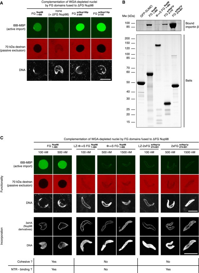 Figure 6. Only Cohesive FG Domains Create a Functional NPC Barrier(A) WGA-depleted egg extracts were complemented with indicated Nup98 derivatives and were used for nuclear assembly. Passive dextran exclusion and active nuclear import were evident when δFG Nup98 had been fused to highly cohesive repeats of either Xenopus Nup98 or S. cerevisiae Nup100 or Nup116. See Figure S4 for additional data.(B) Binding of importin-β to selected FG repeats. Equal masses of bacterially expressed FG domains were immobilized on beads and incubated with an excess of importin-β. Importin-β bound to the Nup98 FG domain as well as to the two Nsp1 FG domain fragments, but not to the ÏâS mutant of Nup98 FG repeats. Please note that such mutations weaken SDS and Coomassie binding and thereby cause an unusual running behavior on SDS-PAGE and lower staining intensity.(C) WGA-depleted egg extract was complemented with various Nup98 derivatives and was used for nuclear assembly. See Figure S5 for characterization of the proteins used. NPC incorporation of 3xHA-tagged Nup98 derivatives was confirmed by anti-HA IF. As detailed in Figure S6, Nup98 derivatives with noncohesive repeats required higher concentrations for efficient NPC binding than wild-type Nup98. This inhibition of NPC binding was overcome by fusion to a tetramerizing leucine zipper (LZ). Nup98 chimeras with any type of noncohesive FG repeats were unable to form a barrier against dextran influx into nuclei and to allow nuclear accumulation of the IBB fusion protein.Scale bars, 25 μm. See also Figure S7.