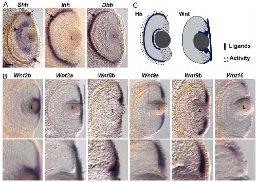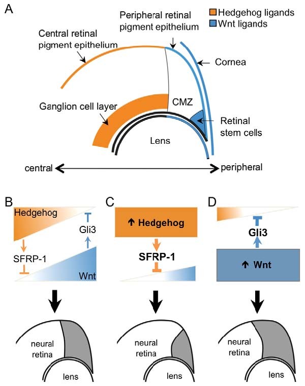 (C)Summary of Hedgehog (Hh) and Wnt ligand expression in the retina, and of domains exhibiting Wnt (in the CMZ) and Hedgehog (in the CMZ