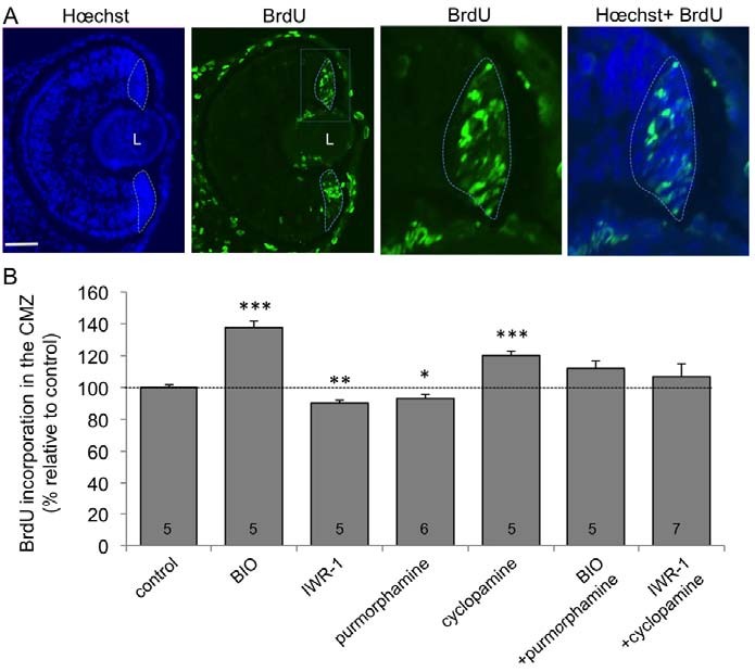 show higher magnifications of the CMZ. (B)Quantification of BrdU+