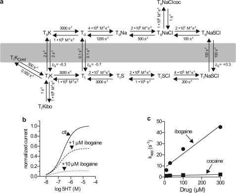 FIGURE 7. A kinetic model for cocaine and ibogaine inhibition of substrate-induced currents in SERT.