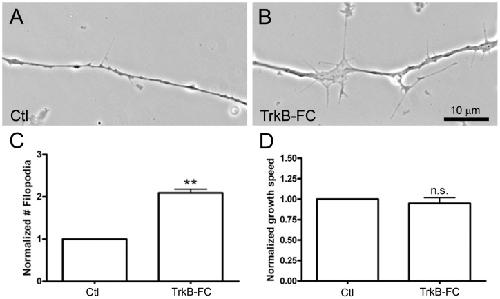 Figure 2. Influence of BDNF-depletion on the formation of axonal filopodia.Spinal neurons were incubated in (A) control medium or (B) medium containing 1 µg/ml TrkB-FC. Axonal filopodial formation was examined 18 h after plating the neurons. Bath application of TrkB-FC enhanced the formation of axonal filopodia, which is quantified in terms of filopodial densities (C). The density of filopodia (#filopodia/10 µm axon) in TrkB-FC-treated neurons was normalized against that in control neurons. In the presence of TrkB-FC, no significant difference in the speed of axonal outgrowth was observed (D). Mean and SEM shown; t test: **p<0.01, compared with untreated Ctl.