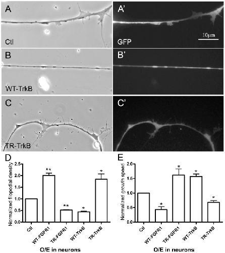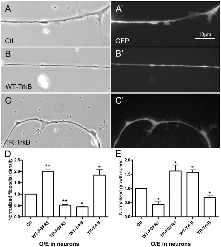 Figure 5. Differential control of filopodial assembly and axonal growth by neuronal FGFR1 and TrkB signaling.Compared to control (GFP) neurons (A and A'), WT-TrkB-neurons grew fewer filopodia (B and B') and TR-TrkB-neurons grew more filopodia (C and C'); panels A–C and A'–C' show corresponding phase-contrast and GFP images. In panel D the filopodial densities calculated for these neurons are normalized relative to the density in GFP-neurons and are compared to those obtained for neurons expressing active and inactive FGFR1 proteins (Figure 4). E. Axonal growth speeds of neurons expressing FGFR1 or TrkB proteins were measured by time-lapse imaging and normalized relative to the growth of GFP-neurons. Overexpression of WT-FGFR1 or TR-TrkB slowed axonal growth, whereas expression of TR-FGFR1 or WT-TrkB sped it up. Mean and SEM shown; t test: *p<0.05, compared with Ctl.