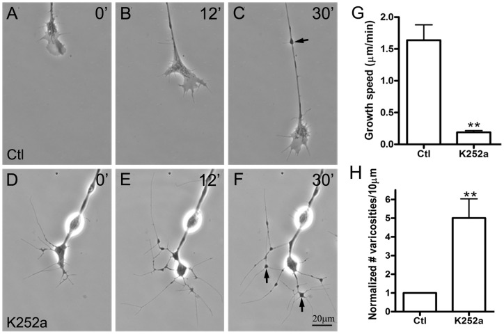 Figure 3. Effect of Trk inhibition on axonal growth.Spinal neurons were incubated in control medium (A–C) or medium containing 500 nM K252a (D–F). The growth speeds of axons were measured from images taken during time-lapse recordings. Treatment with K252a led to a significant reduction in axonal growth speed (G) and also to the elaboration of the distal end of the axon into a web of interconnecting neurites and varicosities within 30 min. Although varicosities were also observed along control axons and were often associated with filopodia (arrow in C), they were much more numerous within the distal neuritic web generated after K252a treatment (arrows in F and quantified in H). Mean and SEM shown; t test: **p<0.01, compared with untreated Ctl.