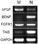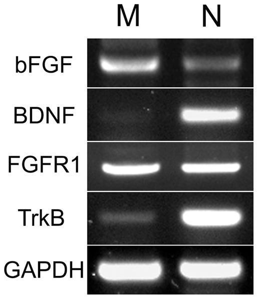 Figure 1. Expression of bFGF/FGFR1 and BDNF/TrkB in Xenopus nerve and muscle.These agarose gel photographs show RT-PCR-generated fragments from mRNAs of bFGF, BDNF, FGFR1, TrkB and GAPDH in neural tubes (N) and myotomes (M) isolated from Xenopus embryos. GAPDH was used as an amplification and loading control.