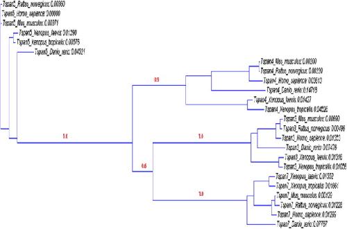 Fig. 2. Phylogenetic analysis of the tetraspanins Tspan3, Tspan4, Tspan5 and Tspan7. The phylogram was generated using ClustalW2 algorithm on the EBI public server http://www.ebi.ac.uk/Tools/phylogeny/clustalw2_phylogeny/ and includes Danio rerio, Xenopus laevis, Xenopus tropicalis, Mus musculus, Rattus norvegicus and Homo sapiens homologs of the tetraspanins analyzed.