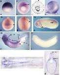 Fig. 6. Expression of Tspan4 during Xenopus development. (A, B and EâH) Whole mount in situ hybridization of Tspan4 encoding gene Tm4sf7 on stage 8â31 Xenopus embryos as indicated. (I) Control in situ hybridization with sense probe for Tm4sf7 at stage 31. Vegetal views (AâC), anterior view (E), dorsal view, anterior to up (F), lateral views, anterior to left (GâI). (C) Schematic representation of a stage 11.5 embryo modified from Nieuwkoop and Faber (1967). (D) Semi-sections of embryos shown in C as indicated. (J and K) Vibratome sections of embryos shown in H as indicated. CNC = cranial neural crest, DMZ = dorsal marginal zone, NF = neural fold, OC = optic cup, OV = otic vesicle, PSM = pre-somitic mesoderm, SO = somites, TNC = trunk neural crest. Scale bar 450 μm (AâI) and 100 μm (J and K).
