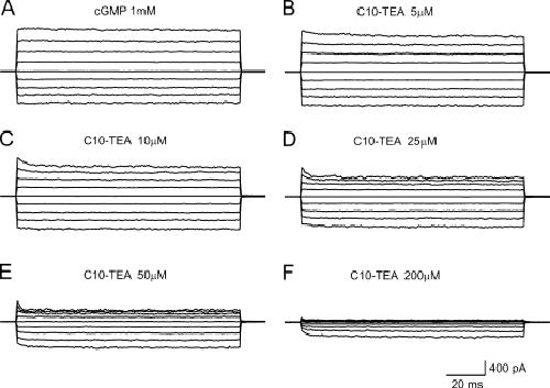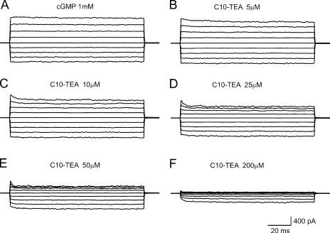 Figure 1. C10-TEA blocks CNG channels. Leak-subtracted currents in response to 1 mM cGMP in the absence (A) and in the presence (B–F) of increasing concentrations of C10-TEA. All these current traces were acquired from the same inside-out patch and in response to voltage jumps from −80 to +80 mV in steps of 20 mV, from a holding potential of 0 mV.