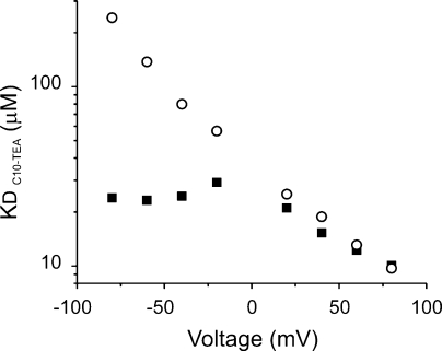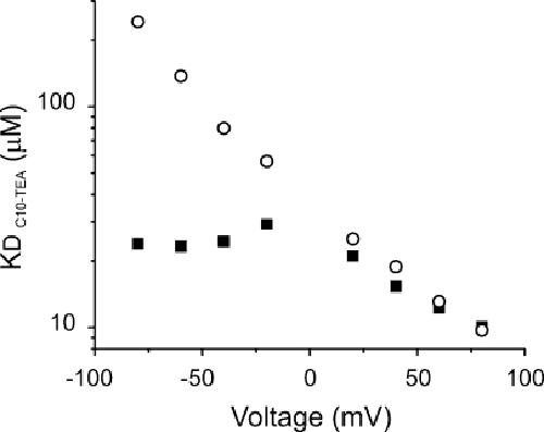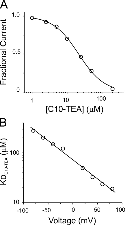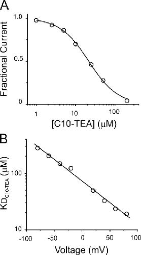 Figure 2. General properties of C10-TEA blockade. (A) Normalized dose–response at +80 mV. The solid line represents the fit to a Hill equation (see text; Eq. 1). The best-fit parameter values for KD and n were 21.5 ± 0.6 μM and 1.19 ± 0.04, respectively. (B) Voltage dependence of C10-TEA blockade. KD values at each voltage were estimated by Eq. 2. The solid line represents the fit to a Woodhull-type model (Eq. 3). The best-fit parameter value for δ is −0.45.
