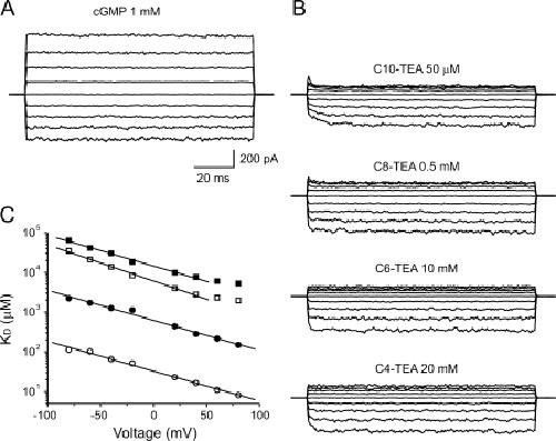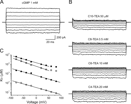 Figure 4. General properties of blockade by alkyl-TEA derivatives. (A) Control conditions. Leak-subtracted currents in the presence of 1 mM cGMP acquired in response to voltage jumps from −80 to +80 mV in steps of 20 mV, from a holding potential of 0 mV. (B) Leak subtraction currents from the same patch and under the same conditions as A, but in the presence of QA derivatives with successively smaller alkyl chains. (C) Voltage dependence of blockade by QA derivatives. KD values at each voltage were estimated by Eq. 2. Solid lines represent Woodhull model fits (Eq. 3). The best-fit parameter values for δ and KD were −0.44 ± 0.01, 32 ± 2 μM (C10-TEA; open circles); −0.44 ± 0.02, 605 ± 7 μM (C8-TEA; filled circles); −0.53 ± 0.02, 6144 ± 21 μM (C6-TEA; open squares); −0.45 ± 0.02, 14642 ± 35 μM (C4-TEA; filled squares).