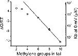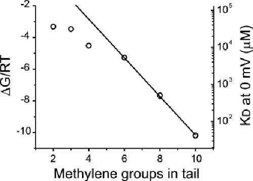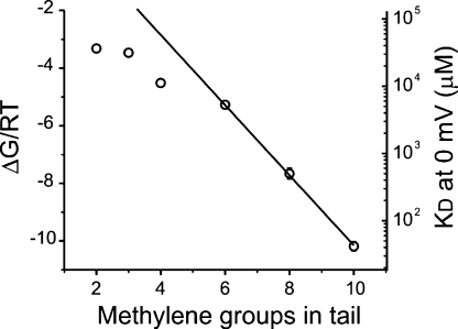 Figure 5. Binding energy decreases as the length of the alkyl tail is shortened. The binding energy of each blocker was calculated from the values of KD0 by assuming an arbitrary standard concentration of 1 M (ΔG = −RT ln(1M/KD0)). Binding energies are plotted in RT units. The line represents a fit of the binding energies for C6-, C8-, and C10-TEA to a straight line. The best-fit value for the slope is −1.22 ± 0.03, which means an increase of binding energy of ∼1.2 RT for each additional methylene group. Except for C8- and C10-TEA, all standard errors are smaller than the size of the symbols.