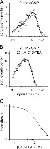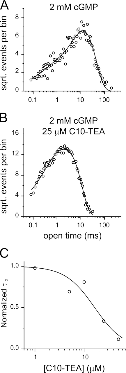 Figure 8. C10-TEA binds to an open channel. (A and B) Open dwell-time distributions at +70 mV under saturating (2 mM) cGMP concentrations in the absence and presence of 25 μM of C10-TEA. The solid lines represent double-exponential fits to the data. The best-fit parameter values were τ1 = 0.7 ms, A1 = 0.07, τ2 = 12.2 ms, and A2 = 0.93 in control conditions and τ1 = 0.6 ms, A1 = 0.19, τ2 = 3.7 ms, and A2 = 0.81 in the presence of the blocker. (C) C10-TEA dose response of the apparent mean open time of the slow component (τ2). In each concentration, the effect of C10-TEA was normalized to the value of τ2 in the absence of the blocker. The solid line represents a Hill equation fit with a best-fit parameter value for the midpoint of 16 ± 4 μM.