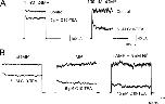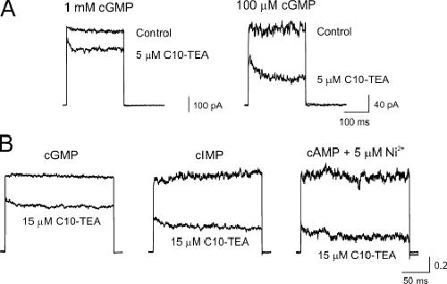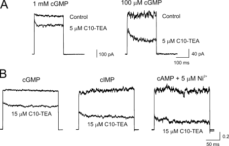 Figure 9. C10-TEA binds to closed channels: effects of agonists. (A) Leak-subtracted current traces to +80 mV in a patch where blockade by 5 μM C10-TEA was assessed under saturating (left) and subsaturating (right) concentrations of cGMP. (B) Leak-subtracted current traces to +80 mV in a patch where blockade by 15 μM C10-TEA was evaluated under saturating (16 mM) concentrations of cGMP (left), cIMP (middle), and cAMP (right). Each set of traces was normalized to a value of 1 in the absence of the blocker, therefore the ordinate scale lacks units.