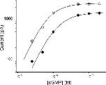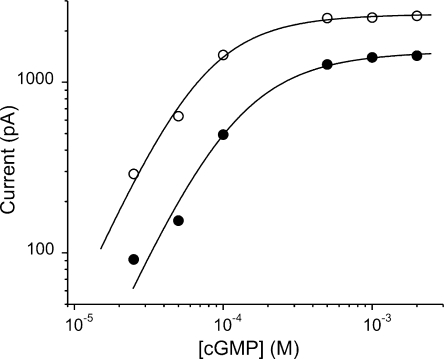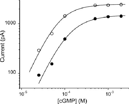 Figure 10. C10-TEA binds to closed channels: steady-state cGMP activation. Open circles show the dose response for cGMP in the absence of C10-TEA. The solid line represents a fit of Scheme 2 to the dose response data. Parameter K was fixed at 3500 M−1 (Fodor et al., 1997a), and L and Imax were allowed to vary. The best-fit parameter values for L and Imax were 16 ± 1 and 2533 ± 45 pA, respectively. Filled circles illustrate the dose response for cGMP in the presence of 10 μM C10-TEA. The solid line symbolizes a fit of the model shown in text to the dose response data. In this fit, L and Imax were fixed to the values obtained in the absence of the blocker. The best-fit parameter values for KDc and KDo were 3 ± 0.3 and 21 ± 2 μM, respectively.