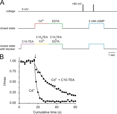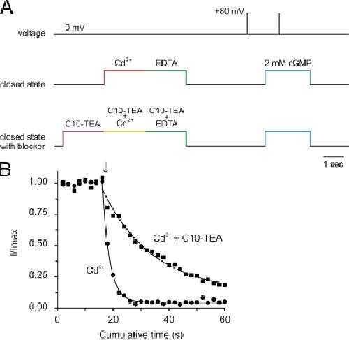 Figure 12. C10-TEA slows Cd2+ inhibition of 391C CNGA1 channels in the closed state. (A) The experimental protocol consisted of 2-s treatment with 6 μM Cd2+ ions with solutions lacking divalent chelators. Immediately after treatment, the patch was perfused with a solution containing 200 μM EDTA to quickly chelate any Cd2+ contamination. In addition, when the effect of the presence of C10-TEA was assessed, the Cd2+-C10-TEA treatment was preceded and followed by 2-s perfusion with solutions containing C10-TEA in the absence of Cd2+. (B) Filled circles correspond to an experiment in which 6 μM Cd2+ treatments in the closed state were initiated at the arrow. The solid line through symbols represents a single exponential fit. The best-fit parameter value for τ was 2.64 ± 0.08 s. Filled squares symbolize an experiment in which 6 μM Cd2+ was applied in the presence of 200 μM C10-TEA. In this case, the best-fit parameter value for τ was 18 ± 2 s.