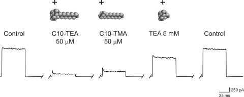 Figure 3. The tail of C10-TEA is a major contributor to the binding affinity to CNG channels. Leak-subtracted currents from five consecutive traces in the presence of 1 mM cGMP to a voltage step of +80 mV, from a holding potential of 0 mV. All traces were obtained from the same inside-out patch. The first trace from the left was acquired in the absence of any blocker, the second in the presence of 50 μM C10-TEA, the third with 50 μM C10-TMA, the fourth with 5 mM TEA, and finally the experiment was bracketed with control conditions. Between traces, the patch was perfused with a solution devoid of cGMP and blocker for at least 30 s. Leak currents were acquired during these periods and they showed no changes throughout the experiment.