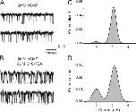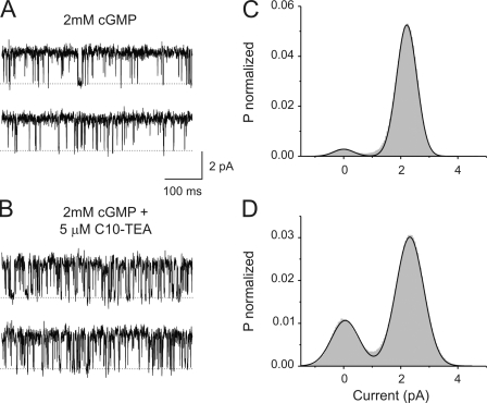 Figure 7. C10-TEA blockade at the single channel level. (A) Single channel recordings at +70 mV with solutions containing 2 mM cGMP. (B) Single channel recordings from the same channel in the presence of 2 mM cGMP and 5 μM of C10-TEA. Dashed lines represent the current level when the channel is closed. (C) Amplitude histogram from 20 s of recording in the presence of 2 mM cGMP. The solid line represents a two-component Gaussian fit. The best-fit parameter value for the amplitude for the open state was 2.209 ± 0.002 pA, comprising an area of 95%. (D) Amplitude histogram from 40 s of recording in the presence of 2 mM cGMP and 5 μM of C10-TEA. The solid line represents a two-component Gaussian fit. The best-fit parameter value for the amplitude for the open state was 2.317 ± 0.002 pA, contributing to an area of 74%.