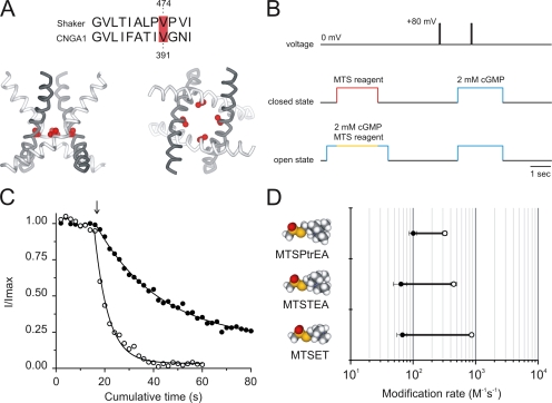 Figure 11. MTS reagents of comparable sizes to QA blockers can access position V391C in closed CNGA1 channels. (A) Alignment of the intracellular side of the S6 segment of Shaker Kv and CNGA1 channels. In red is highlighted the position where chemical modification was assessed. The bottom part shows the S6 helices from the X-ray crystal structure of Kv1.2 (Long et al., 2005). On the left is shown a side view of the S6 helices and on the right is shown an intracellular view. Cβ and Cγ atoms of V474 are represented in red. (B) The experimental protocol consisted of 2-s reagent application at 0 mV in the presence (open state) or absence (closed state) of 2 mM cGMP. A brief 50-ms depolarization to +80 mV in the presence of 2 mM cGMP was applied to monitor the cGMP-activated current (blue step). Leak currents were acquired by a similar pulse to +80 mV but in the absence of cGMP. This protocol was applied every 15 s. (C) Modification of 391C CNGA1 channels by 500 μM MTS-PtrEA in the open (open circles) and in the closed states (filled circles). Circles symbolize leak-subtracted currents normalized to the average maximal current from the eight records acquired previous to MTS-PtrEA treatment (arrow). The decrease in cGMP-dependent currents were fitted to single exponentials (solid lines). The best-fitted parameter values for τ were 5.7 ± 0.3 and 27 ± 1 s for the open and closed state, respectively. (D) Modification rates in the open (open circles) and closed states (filled circles) for 391C CNGA1 channels by three different MTS reagents. Structural models of each reagent are shown. Symbols represent the mean of at least three experiments.