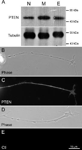 FIGURE 1:. Expression of PTEN in embryonic Xenopus spinal neurons. (A) PTEN expression in Xenopus tissues was assessed by immunoblotting. Extracts of Xenopus neural tubes (N), myotomal muscle (M), and whole embryos (E) were stained with an anti-PTEN antibody (top blot) and with anti-tubulin antibody to compare protein loading (bottom blot). Molecular weight marker positions are indicated on the right. (B–E) PTEN expression in neurons was examined by immunolabeling. Fixed and permeabilized embryonic spinal neurons were labeled with anti-PTEN and FITC-conjugated secondary antibodies (PTEN; B and C) or secondary antibodies alone (Ctl; D and E). Labeling for PTEN was detected along axons and also in growth cones (C).