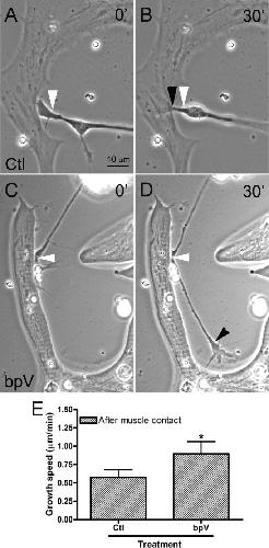 FIGURE 3:. Effect of bpV on axonal growth after NMJ formation. Spinal neurons were seeded on muscle cultures to allow NMJ formation. After 12–16 h, control or 100 nM bpV-containing medium was added to the cocultures. (A and B) In control cultures, little growth of the axon was seen at nerve–muscle contact sites within 30 min, but in bpV-treated cultures (C and D), axons were observed to resume active growth during the 30-min recording period. (E) Quantification of axonal growth speeds in untreated (Ctl) and bpV-treated cocultures. Mean ± SEM; t test: *, p = 0.05 compared with Ctl. Arrowheads indicate initial and final positions of the terminal ends of axonal shafts (A–D). Number of axons examined by time-lapse recording: 16 (Ctl-after contact), 11 (bpV-after contact).