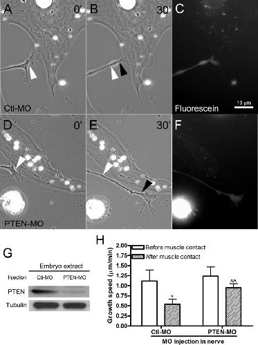FIGURE 4:. Increase in axonal growth speed following the reduction of PTEN expression in neurons. Spinal neurons were isolated from embryos injected with control MO (Ctl-MO; A–C) or PTEN-specific MO(PTEN-MO; D–F) and cocultured with muscle cells obtained from uninjected embryos. Axons with Ctl-MO and PTEN-MO both slowed after contact with muscle, but after touching muscle, PTEN-MO-axons grew nearly as fast as control axons did before muscle contact. Arrowheads indicate initial and final positions of the terminal ends of axons (A, B, D, and E), and the presence of MOs tagged with fluorescein is shown by the fluorescence of the axons (C and F). (G) Immunoblots showing that PTEN expression was knocked down in Xenopus embryos injected with PTEN-MO but not Ctl-MO (top blot); anti-tubulin staining shows protein loading (bottom blot). (H) Quantification of growth speeds of axons with Ctl-MO and PTEN-MO. Mean ± SEM; t test: *, p = 0.02 compared with Ctl-MO-axons before contact with muscle; ^^, p < 0.005 relative to growth speed of Ctl-MO-axons after muscle contact; number of axons examined by time-lapse recording: 8 (Ctl-MO before contact), 30 (Ctl-MO after contact), 15 (PTEN-MO before contact), 33 (PTEN-MO after contact).