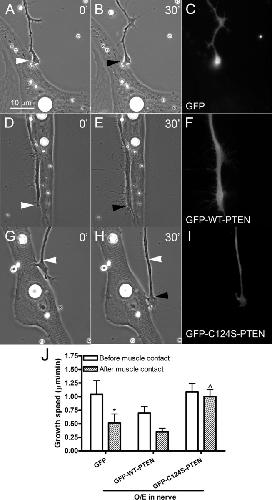 FIGURE 5:. Regulation of axonal advance by exogenous PTEN proteins. Spinal neurons were cultured from Xenopus embryos injected with mRNAs encoding GFP (A–C) and GFP-tagged wild-type PTEN (GFP-WT-PTEN; D–F) or catalytically inactive PTEN (GFP-C124S-PTEN; G–I). These neurons were seeded on muscle cells cultured from uninjected embryos, and axonal growth was monitored by time-lapse imaging. After contact with muscle cells, axons overexpressing wild-type PTEN grew more slowly than control GFP axons, whereas axons expressing inactive PTEN grew faster. The advance of axons can be compared using the arrowheads that mark the terminal ends of growth cones; the expression of exogenous proteins in the axons is shown by GFP fluorescence (C, F, and I). (J) The average growth speeds of axons (expressing exogenous proteins) before and after muscle contact were quantified and are shown as mean ± SEM. t test: *, p = 0.04 relative to GFP axons before muscle contact; ^, p = 0.02 compared with GFP axons after contact with muscle. Number of axons examined by time-lapse recording: 7 (GFP-before contact), 11 (GFP-after contact), 12 (GFP-WT-PTEN-before contact), 17 (GFP-WT-PTEN-after contact), 18 (GFP-C124S-PTEN-before contact), 25 (GFP-C124S-PTEN-after contact).