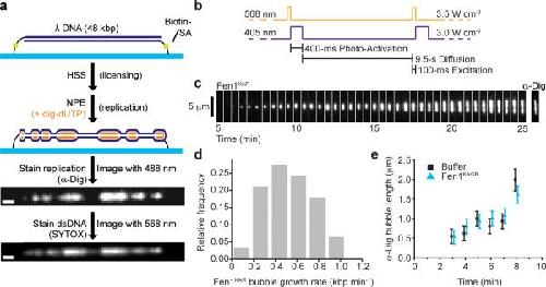 Figure 2. PhADE imaging of Fen1KikR visualizes the growth of individual replication bubbles(a) Scheme for replication of surface-immobilized λ DNA by Xenopus egg extracts and detection of replication bubbles. λ DNA is attached to the bottom surface of a flow cell at both ends. Next, the DNA is licensed with HSS. Replication is promoted with NPE supplemented with dig-dUTP and, for PhADE imaging, Fen1KikGR. After real-time imaging of Fen1KikR (see below), the extracts are removed, and replicated DNA is stained with α-Dig and/or SYTOX Orange. Scale bar: 1 μm. (b) PhADE sequence used to visualize the growth of D179A Fen1KikR-labeled replication bubbles. (c) Replication was carried out in the presence of 4 μM D179A Fen1KikGR and Dig-dUTP under conditions of limited origin firing (Supplementary Fig. 4a–b). Between 5 and 25 minutes after the first NPE addition, D179A Fen1KikR was imaged every 10 s using PhADE. A sample kymograph shows every third frame of a replication bubble growing over time. After the last PhADE cycle, replicated DNA was stained with α-Dig. (d) Histogram of bubble growth rates tracked between 5 and 25 minutes displays a mean of 520 ± 220 bp min−1 (± s.d.), (n = 62 events from 3 independent experiments). (e) Average length of replication bubbles as measured by α-Dig staining, in the presence (blue triangles) or absence (black squares) of 2 μM D179A Fen1KikGR. Mean ± error estimate (see Online Methods). See also Supplementary Table 1.