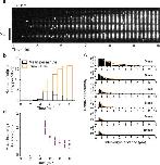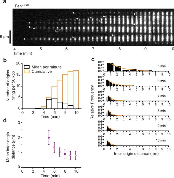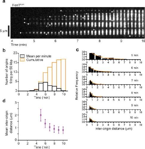 Figure 3. During unperturbed replication, PhADE imaging of Fen1KikR reveals a high density of initiations(a) Replication of λ DNA during unrestricted origin firing was monitored by PhADE imaging (as in Fig. 2b) of 2 μM D179A Fen1KikGR and displayed as a kymograph. White arrows indicate initiations. (b) PhADE kymographs as in Figure 3a were analyzed to determine the mean number of origins firing each minute (black) or cumulatively (orange) per λ DNA (n = 12 λ DNA). Similar results were obtained in a second extract (Supplementary Fig. 5c). (c) PhADE kymographs as in Figure 3a were analyzed to determine the distance between adjacent initiations over time. Black bars, reliable resolution limit (> 0.5 μm). Orange lines, single exponential decay fit to bars > 0.5 μm. (d) The mean inter-origin distance as determined from 12 replicating λ DNA molecules followed via D179A Fen1KikR PhADE declines over time. Mean ± error estimate (see Online Methods). Similar results were obtained in a second extract (Supplementary Fig. 5d).