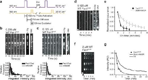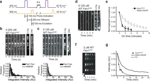 Figure 4. PhADE reveals single molecules of Fen1KikGR at replication forks and measures Fen1KikGR off rate from DNA(a) Imaging sequence for Figure 4b–c. (b) Replication in the presence of 0.25 μM WT Fen1KikGR. (top) A representative kymograph of Fen1KikR on λ DNA imaged every 10 s. After the final round of PhADE, replication bubbles and DNA were detected. 132 Fen1KikR foci were localized to 113 replication bubbles. Scale bar: 1 μm. (bottom) Intensity histogram of Fen1KikR foci on bubbles (black) versus single molecules of biotin-mKikR (gray). (c) As in Figure 4b but using 0.125 μM WT Fen1KikGR. 112 Fen1KikR foci were found on 129 replication bubbles. (d) DNA was replicated in the presence of 0.125 μM wild-type Fen1KikGR and Fen1KikR was imaged as in Supplementary Figure 7a before (first frame) and after photoactivation (frames 2–6). Afterwards, replication bubbles and DNA were detected. Scale bar: 1 μm. (e) The duration of wild-type Fen1KikR binding at replication bubbles is compared to the fluorescence on times of immobilized Biotin-mKikR. (wild-type Fen1KikR: mean ± s.d. of 3 experiments, n = 40 events; Biotin-mKikGR: mean ± s.d. of 6 experiments, n = 1,165 events, points are fit to a mono-exponential decay). (f) DNA was replicated in the presence of 2 μM WT Fen1KikGR. Fen1KikR was photoactivated once (black triangle) and imaged once a minute as depicted in Supplementary Figure 7c. Scale bar: 1 μm. (g) Normalized, integrated intensity of the region in Figure 4f (squares) is compared to Biotin-mKikR photobleaching (solid line) under the same imaging conditions. Biexponential fit (dashed line) reveals a mean life-time of 0.7 ± 0.3 min for Fen1KikGR on DNA.