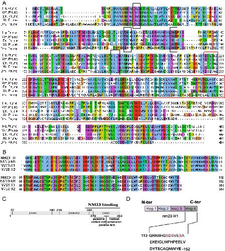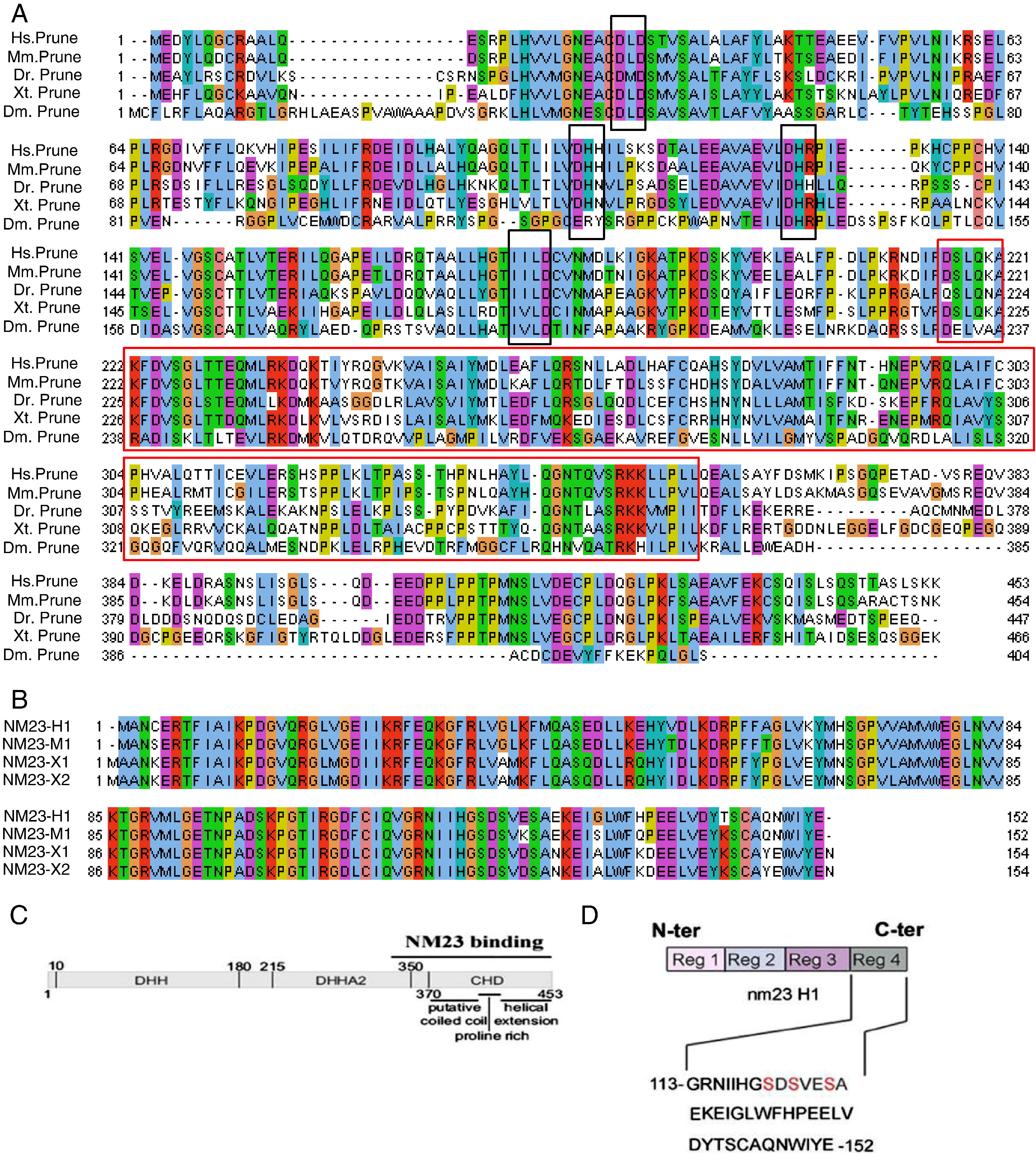 (A) Alignment of amino acid sequences of prune orthologs from human, mouse, zebrafish, Xenopus and Drosophila. Amino acid conservation and the four generic motifs (outlined in black boxes) characteristic of the DHH superfamily are shown. The motif diagnostic of the second group is included in the red box. Numbers indicate the amino acid residues of each protein. (B) Alignment of NM23-1 protein sequences from human (NM23-H1), mouse (NM23-M1) and Xenopus (NM23-X1), and NM23-2 from Xenopus (NM23-X2). (C) Schematic representation of prune and (D) NM23 protein structures highlighting conserved motifs and the respective interacting domains.
