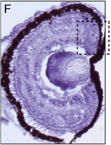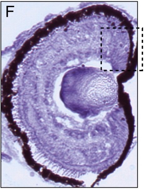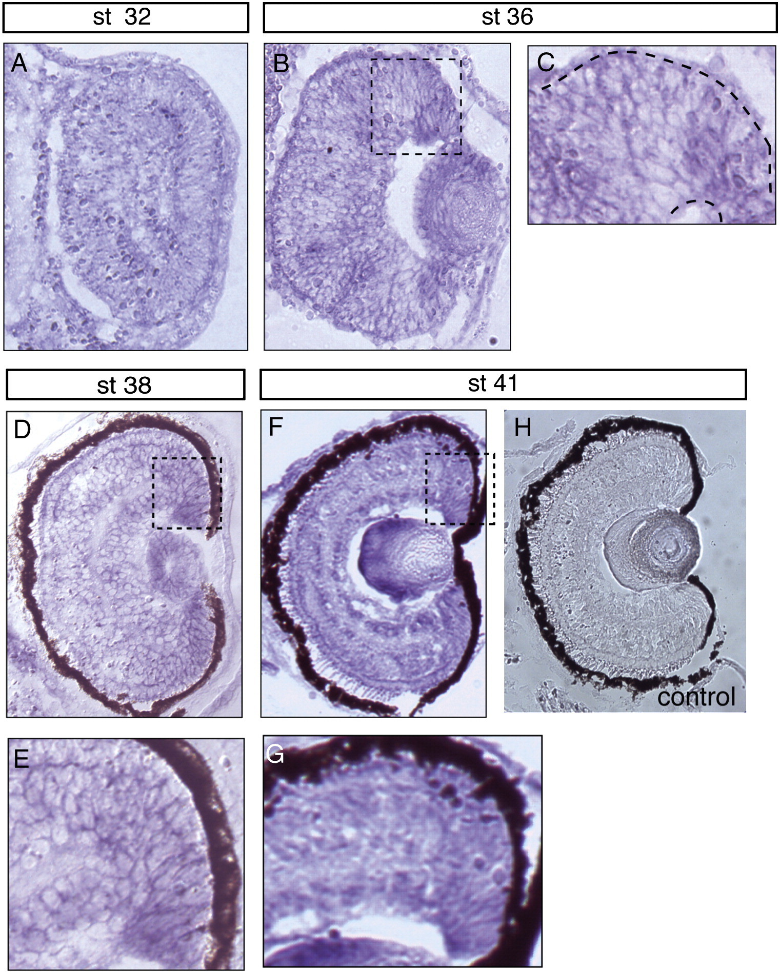 (A) Stage 32; (B) stage 36 and magnification of highlighted area in (C); (D) stage 38 and higher magnification view at (E); (F) stage 41 and highlighted magnification in (G). (H) Control section using sense probe at stage 41. The CMZ area of the retina is highlighted by black dotted squares in (B), (D) and (F) and shown in magnified views in (C), (E) and (G) respectively.