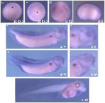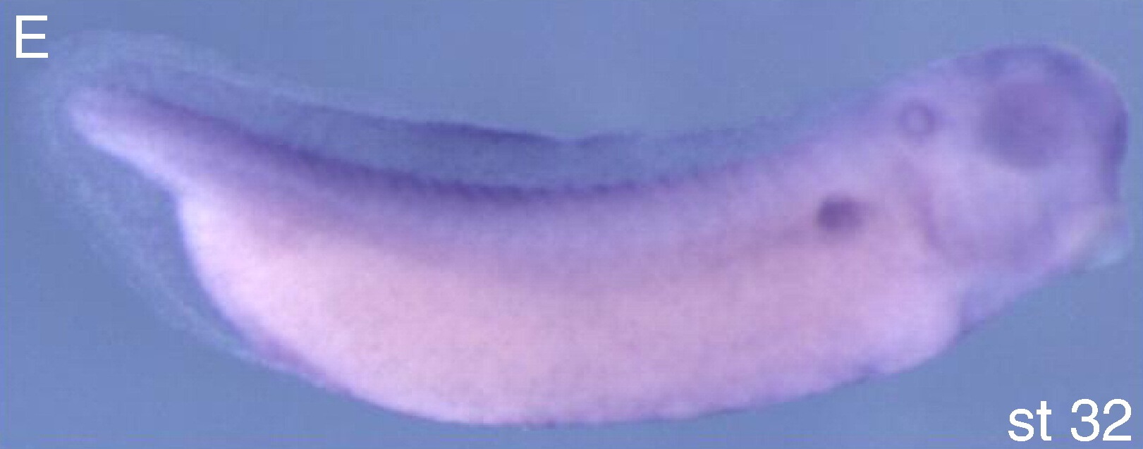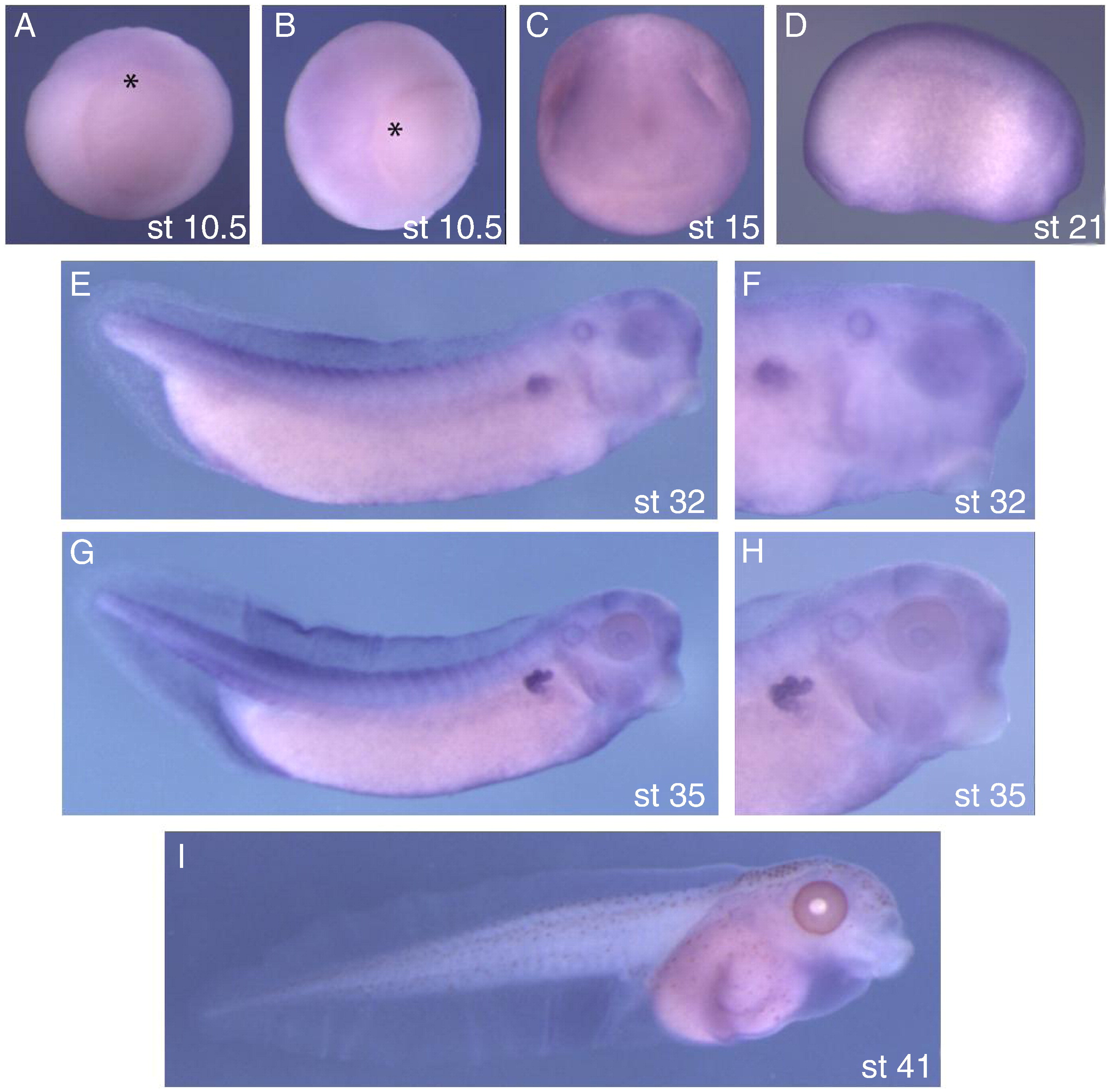 Whole mount in situ hybridization using an anti-sense probe. (A) Stage 10.5, vegetal view, dorsal up; (B) stage 10.5, lateral view, asterisk marks the dorsal lip of blastopore; (C) anterior view, dorsal up; (D) stage 21; (E) stage 32; (F) stage 32, zoom of head region; (G) stage 35; (H) stage 35, zoom of the head; (I) stage 41 tadpole. All views of (DâI) are lateral, anterior to the right.