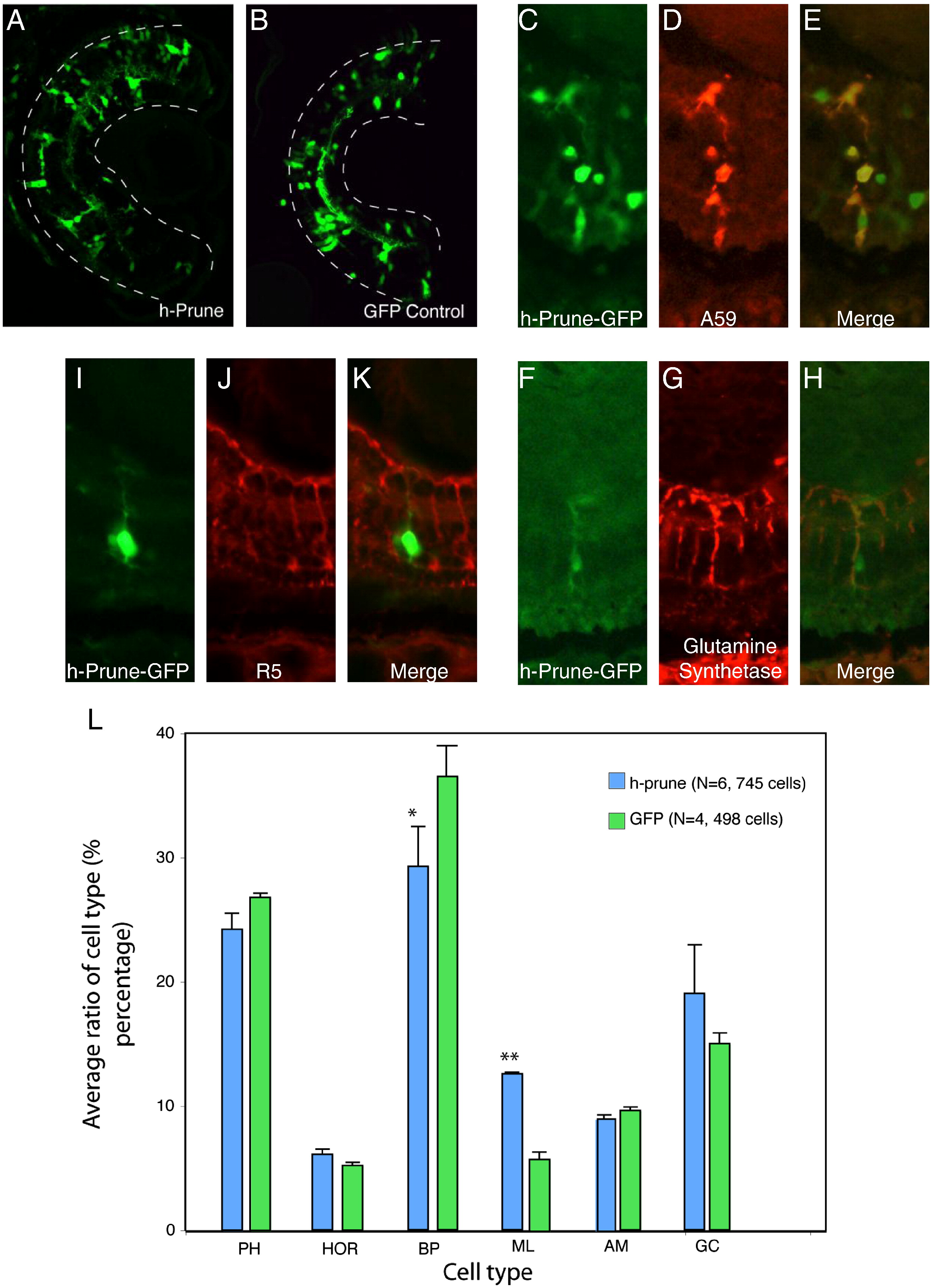 (AâB) H-prune was overexpressed with GFP (green) and then the retina was sectioned at stage 41. Cryosections at stage 41 retinas lipofected with h-prune and GFP (A), or control GFP (B). Dashed lines indicate the outer nuclear layer and inner limiting membrane of retina. (CâE) Cryosection of h-prune and GFP (green, C) co-overexpressed retina was stained with A59 (red, D). Overlaid view (E). GFP positive cells are largely A59 positive. Also, you can observe Müller glial cells at the middle. This indicates that h-prune is indeed overexpressed in the retina. (FâH) H-prune was overexpressed with GFP (green, F). Then the retina was stained by R5 Müller glial cell antibody (red, G). The GFP positive cells are also R5 positive, indicating that the GFP positive cells are Müller glial cells. (IâK) H-prune was overexpressed with GFP (green, I). Then the retina was stained by another Müller glial cell antibody, glutamine synthetase (red, J). The GFP positive cells are also R5 positive, indicating that the GFP positive cells are Müller glial cells. (L) Graphic representation of lipofection results showing percentage of each cell type in the retina using the wild-type human prune construct (h-prune) compared to the GFP control (see text for details). Error bars indicate standard error of the mean; N, the number of retinas analyzed; the asterisks indicate where statistically significant results exist (using Student's T-test compared to the GFP control, as standard methodology), which is: * for p < 0.05, ** and for p < 0.01. PH, photoreceptor cells; HOR, horizontal cells; BP, bipolar cells; ML, Müller glia cells; AM, amacrine cells; GC, ganglion cells.