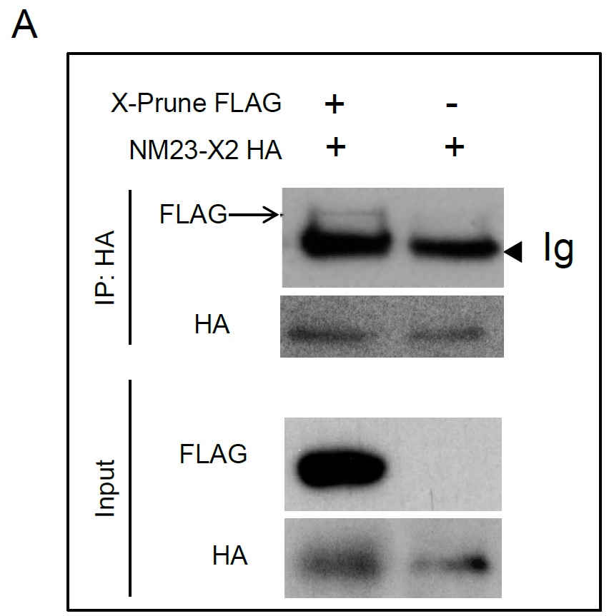 (A) Co-IP analyses of the association of NM23-X2 with X-prune in Hek-293 cells cotransfected with X-prune-Flag and NM23-X2-HA.