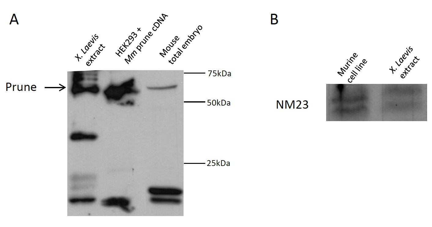 (A) Much larger portion of the western blotting with polyclonal antibody raised against the human prune protein (A59) shown in Figure 4A. (B) Western blot with polyclonal antibody raised against the NM23 protein (K73) in extracts from murine cell line (4T1 mouse breast cancer cell line), and in extracts from X.laevis embryos (16 hpf).