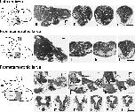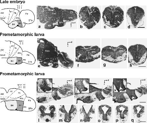 Figure 2. Photomicrographs of Nissl-stained sagittal (a,e,i,j,k) and transverse (b–d,f–h,l–q) sections through the hypothalamus of a late embryo (a–d), a premetamorphic larva (e–h), and a prometamorphic larva (i–q), at the approximate levels indicated on the respective schemes of the left column. Note that the coordinate system for the hypothalamus rotates 90 because the longitudinal axis of the brain bends in the diencephalon, and this is also the case for all photomicrographs of sagittal sections in all figures. These photomicrographs illustrate the poorly segregated regions roughly recognized in the hypothalamus during development. The dashed lines in (a,e) indicate the approximate boundaries between telencephalic, hypothalamic, and diencephalic regions. Scale bars 1⁄4 100 lm in d,h,k’ (applies to a–c,e– g,i’,j); 200 lm in k,q (applies to i,j,l–p).